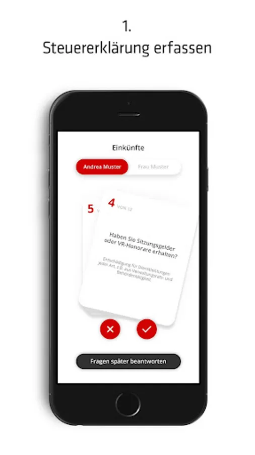By answering the questions in the three areas of income, deductions and asset data are transmitted in correct form on the right site in the tax return.