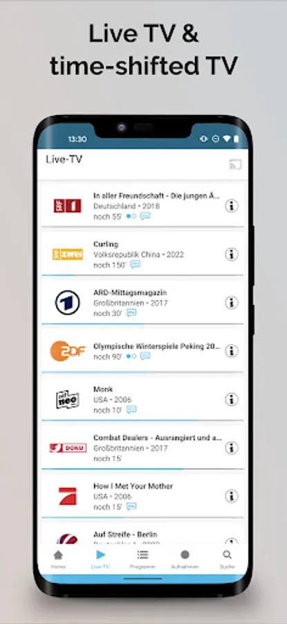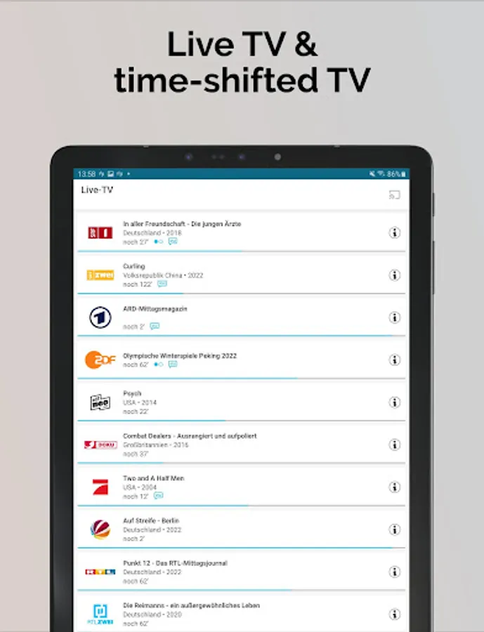 The functions live TV, recordings, replay are only available in Switzerland. Watching TV with your iPhone or iPad over the mobile network may incur additional charges. We recommend using a WLAN connection whenever possible.