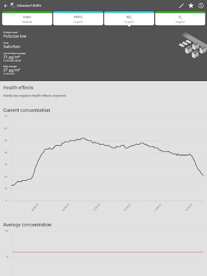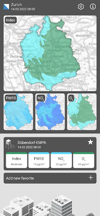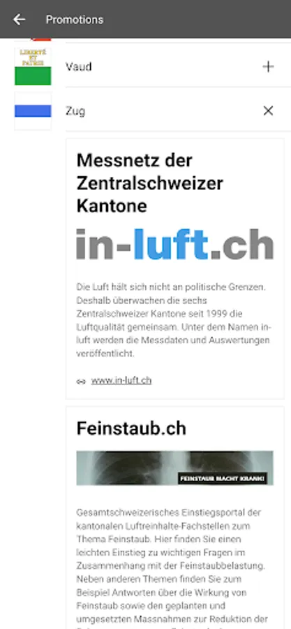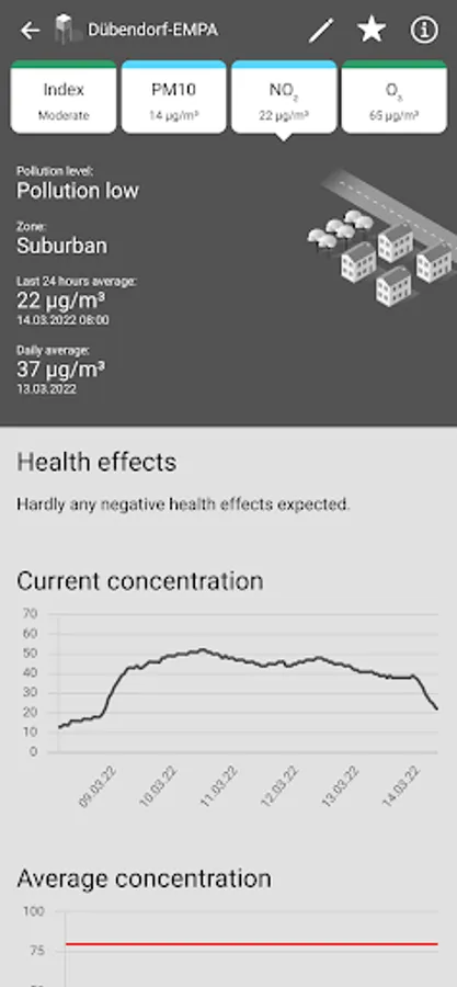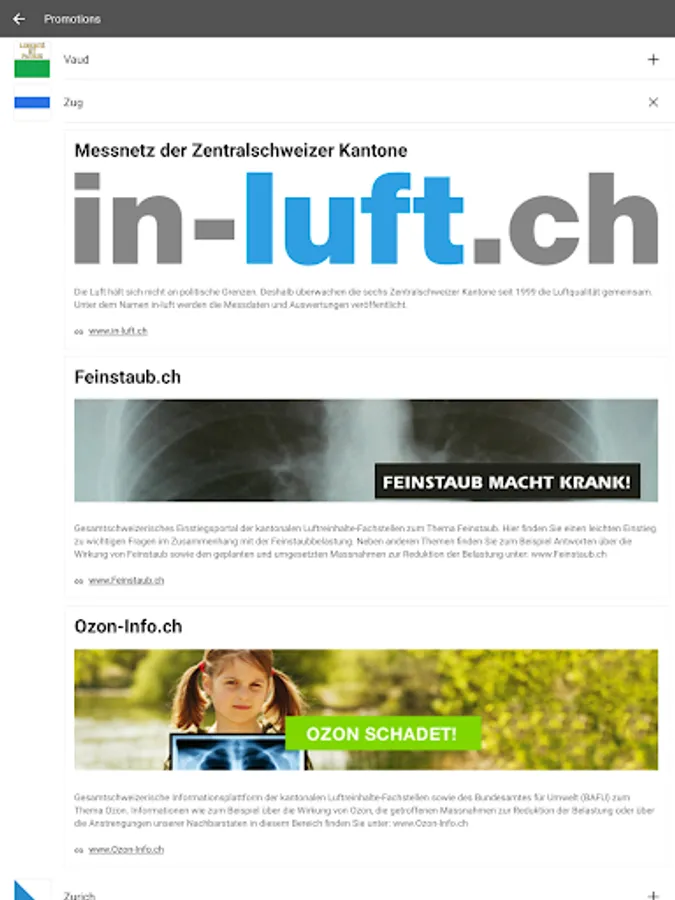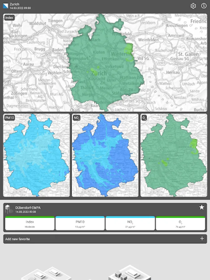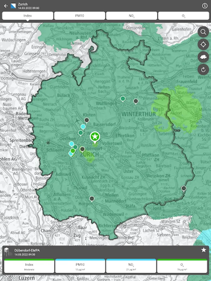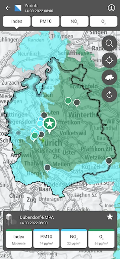 • Informs about the current air quality at your location or in any other arbitrary site in Switzerland and Lichtenstein.