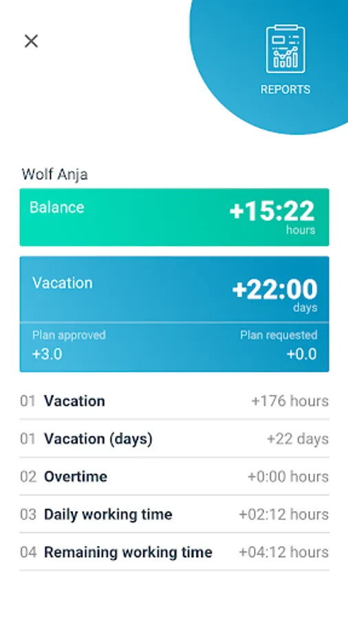 - Time recording: Bookings with display of current times and holiday balances
