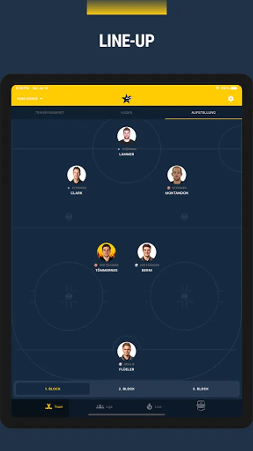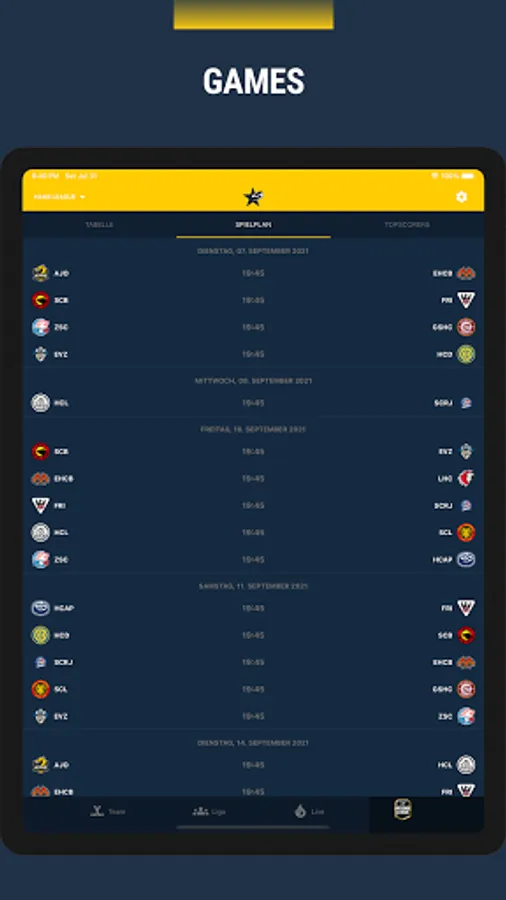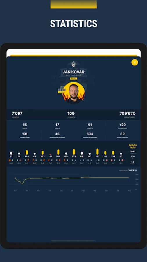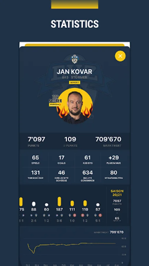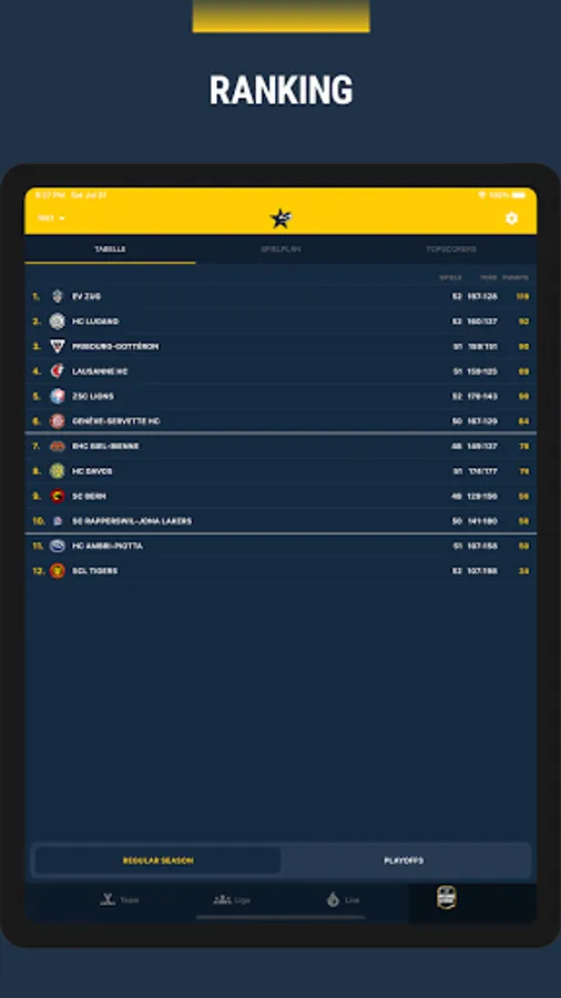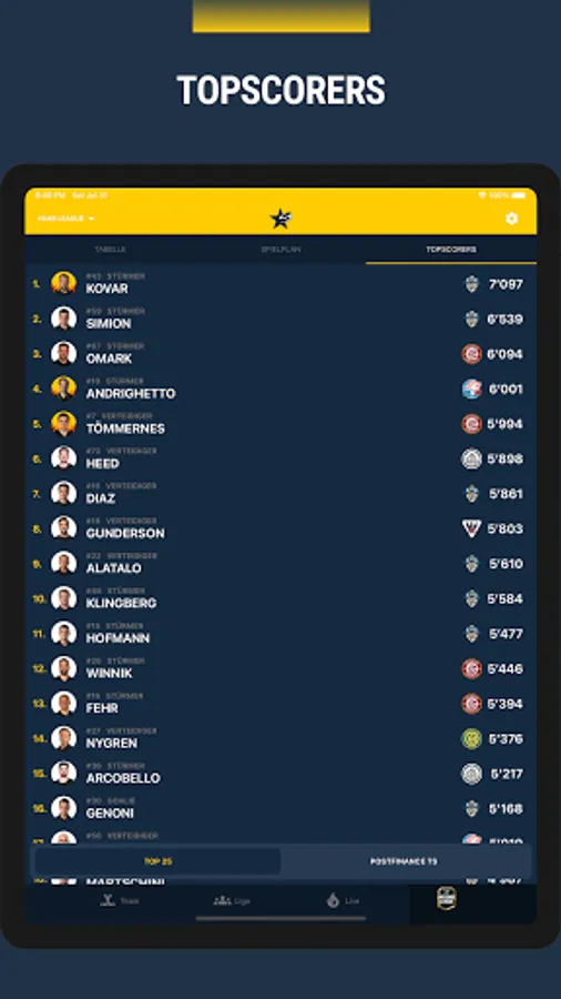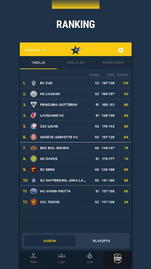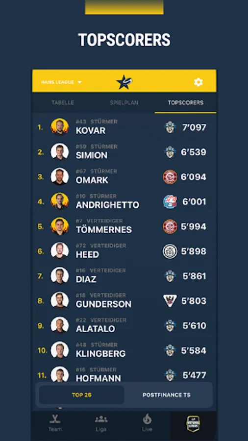 In the Topscorers app, users compete against each other in a league by putting together the most competitive ice hockey team possible from current National League professionals with a set budget. In each league, each hockey player exists only once. Before a game day, each user puts together his team from the players available to him. The sum of the points collected in real time for each player results in the total number of points for his team per game day. The users play to win the regular season (qualifier) and the playoffs (champion).