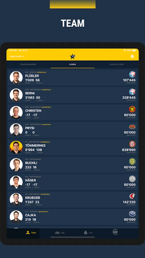 At the beginning of your Topscorers season you will be assigned a 20-player team worth CHF 3 million. The line-up is automatically generated from these 20 players and can be customized. In addition, you will receive a budget of CHF 1 million to make transfers. On the transfer market you can buy new players or sell players from your squad. But be careful, you must not have a negative account balance before the start of the game, otherwise you will not get any points for the whole game day.