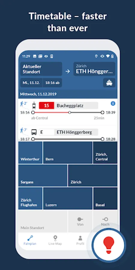 The Viadi Zero live map shows you the current locations of all public transport vehicles in Switzerland at a glance. It has never been so easy to view the timetable, Mobility and PubliBike locations directly on the map.