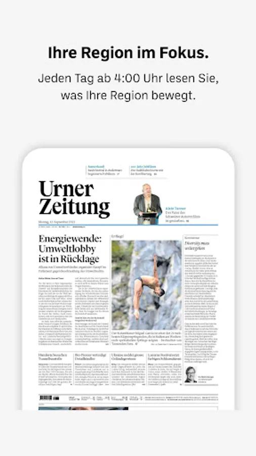 The "Urner Zeitung" is available every day from 4 a.m. in the e-paper app. The output is downloaded either automatically or manually. As soon as the current issue has been downloaded, you can read it without an internet connection, at home or on the go.
