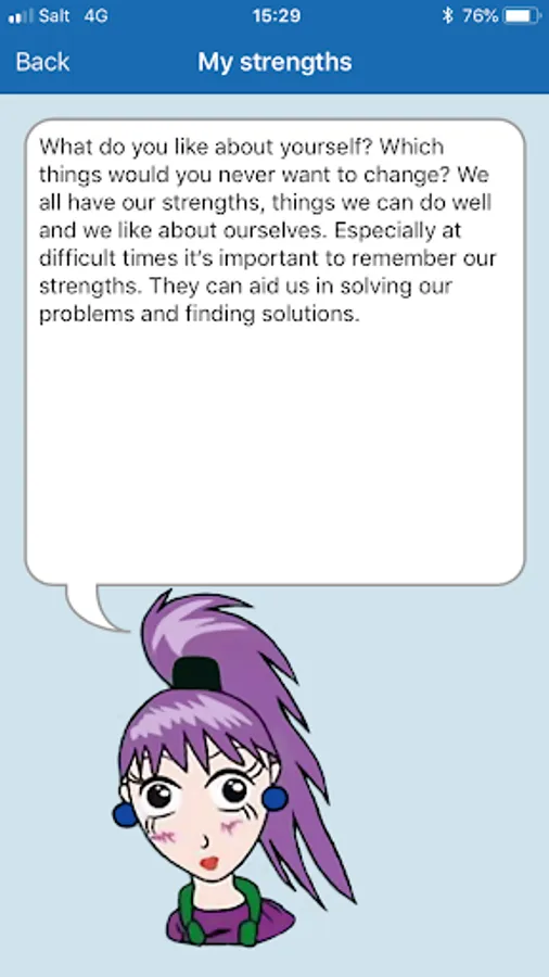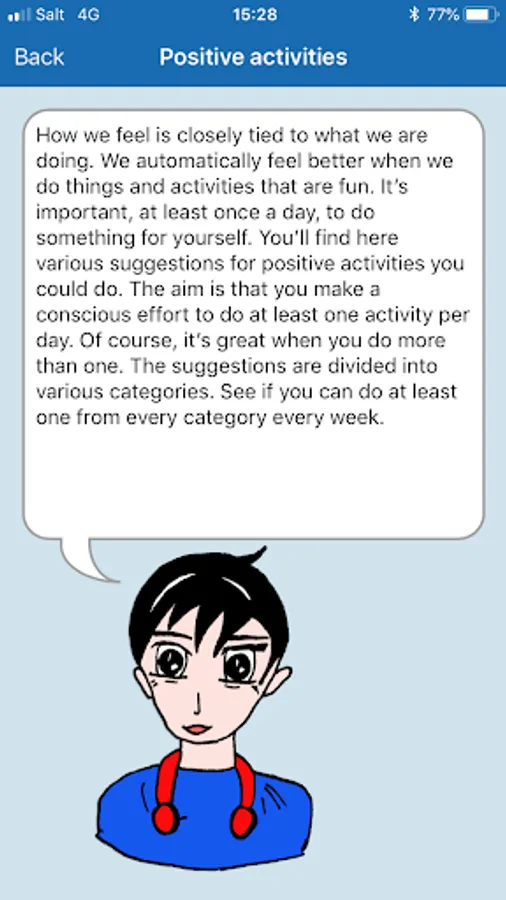 - Library: In this section you can get help to deal with your every day problems. You can create a list of what your strengths are, and there is a gratitude diary where you write about positive experiences you’ve had each day. They’re all easily accessible and can be referred to at any time if you’re feeling down, as a way to help cheer you up. The library also has a section with ideas for activities that you could do to brighten up your mood and day.