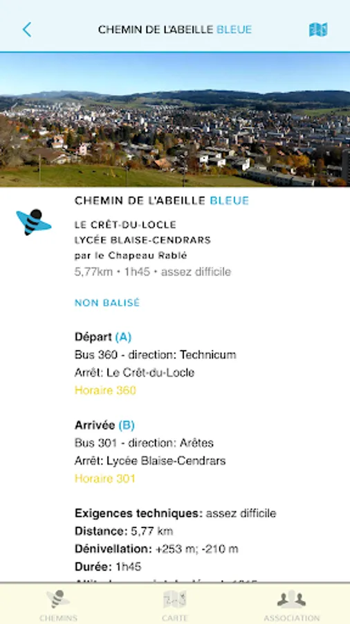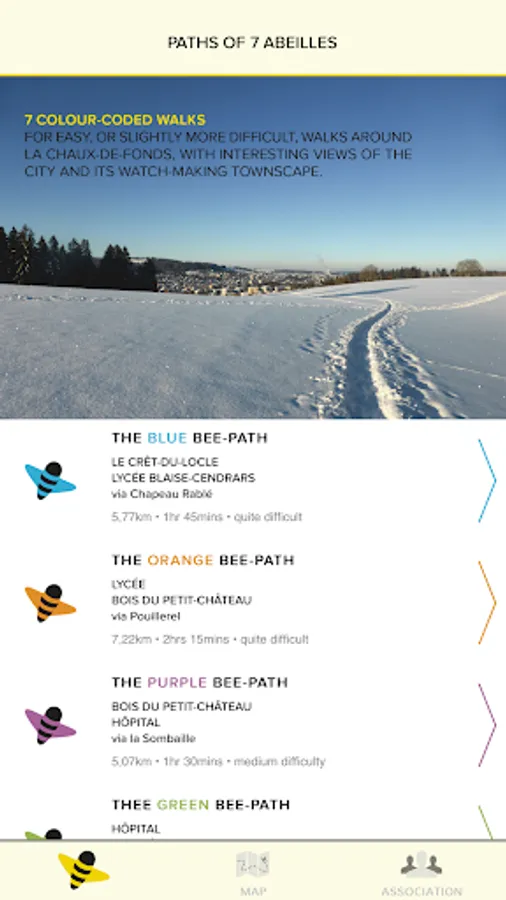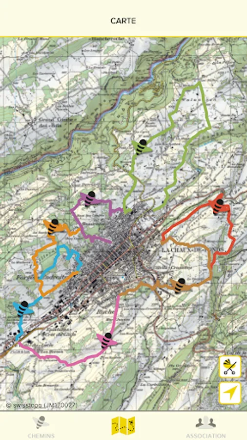 The app shows 7 easy, or slightly more difficult, walks on the edges of La Chaux-de-Fonds. The start and finish of the walks are accessible by public transport and the walks are designed to offer interesting, panoramic views of this Swiss town; it is a watch-making city and UNESCO world heritage site with a population of 40,000, and is often referred to as "a town in the countryside". With the app you can follow the maps without being connected to the Internet.