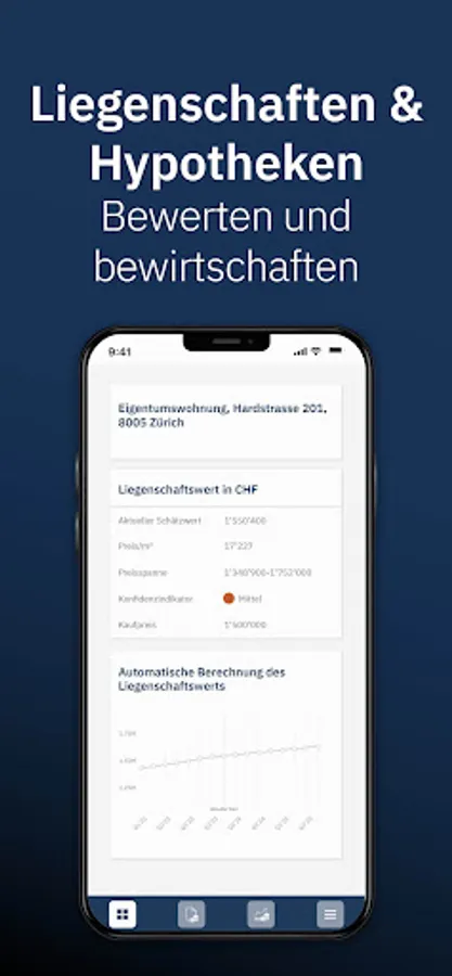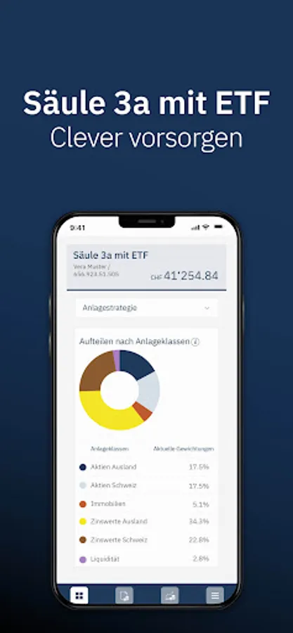 • Assets: display your total assets distributed on accounts, securities custody accounts, pension funds, 3rd pillar, real estate, mortgages and special assets