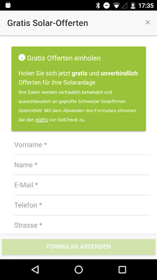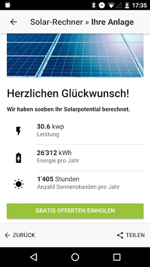 With the new solar calculator app, you can now easily calculate your solar potential. Here, data such as the location, roof orientation and the tilt angle of the system by means of sensors from your smartphone are automatically determined. Divide the result with friends or pick up then free offers by certified Swiss solar suppliers.