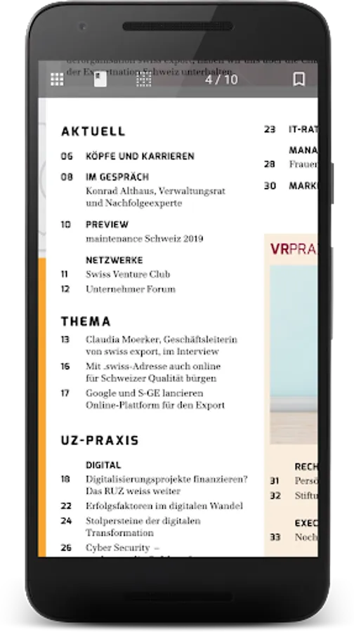 The UnternehmerZeitung is the trade journal of the company owners in German-speaking Switzerland. In talks with business and political figures, business journalists, specialist authors and prominent columnists provide background information, facts and opinions. Economic policy topics are complemented by practice-oriented specialist contributions to controlling, investment, IT, logistics and management. In addition to the existing special category VR-PRACTICE, "marketing today" now appears with a balanced mix of topics for marketing practitioners. Guest columns and rubrics like "Podium", "10 questions to", "Europe" and "Cleantech" make the UnternehmerZeitung a current and reader-friendly business newspaper.
