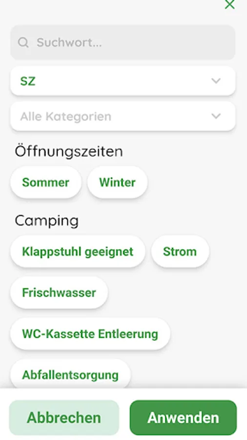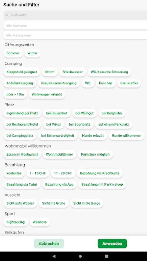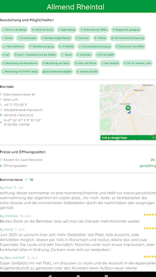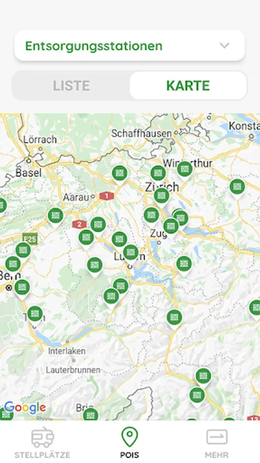 All official motorhome pitches can be seen on the map or as a list. Likewise, all public disposal stations, selected washing systems for mobile homes, LPG filling stations and vehicle scales. In short, all the information a mobile home owner needs in Switzerland.