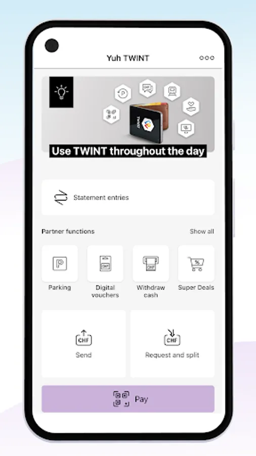 The Yuh TWINT app spices up your payment life: make secure payments with your smartphone in shops, restaurants, online, and when using machines and parking meters. You can also send or request money from your contact list in just a few clicks, buy digital vouchers, make donations, register customer cards and use digital coupons.
