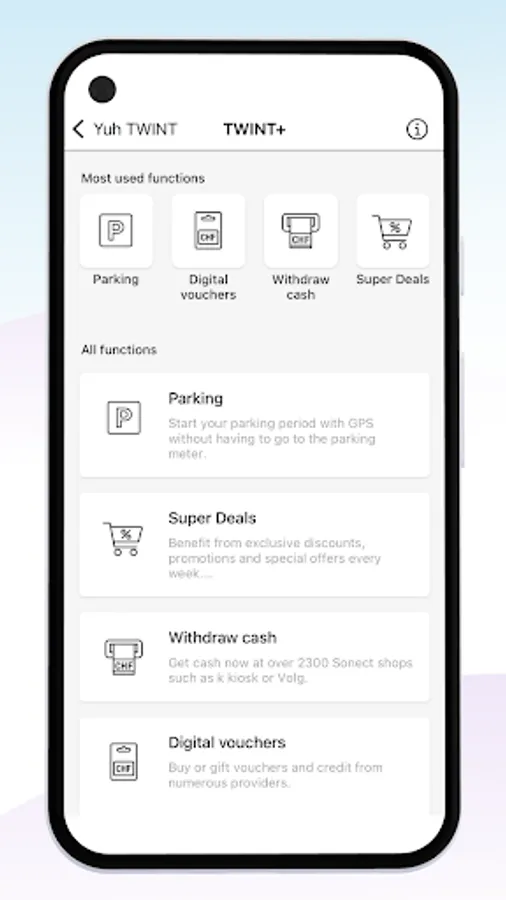 The TWINT+ section provides you with quick access to a range of features available on the Yuh TWINT app: have your meal delivered, buy digital gift vouchers, make a donation, pay your parking fees, withdraw cash or take advantage of Super Deals.