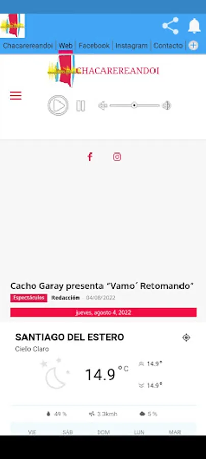 Radio Program for the Diffusion of Popular Music and Folkloric Roots of America + Quichua Santiagueño, turned into Radio Web Chacarereandoi.com by: David Ortiz - Singer-songwriter of Argentine Folklore - Announcer and Operator of Radio Reportero.