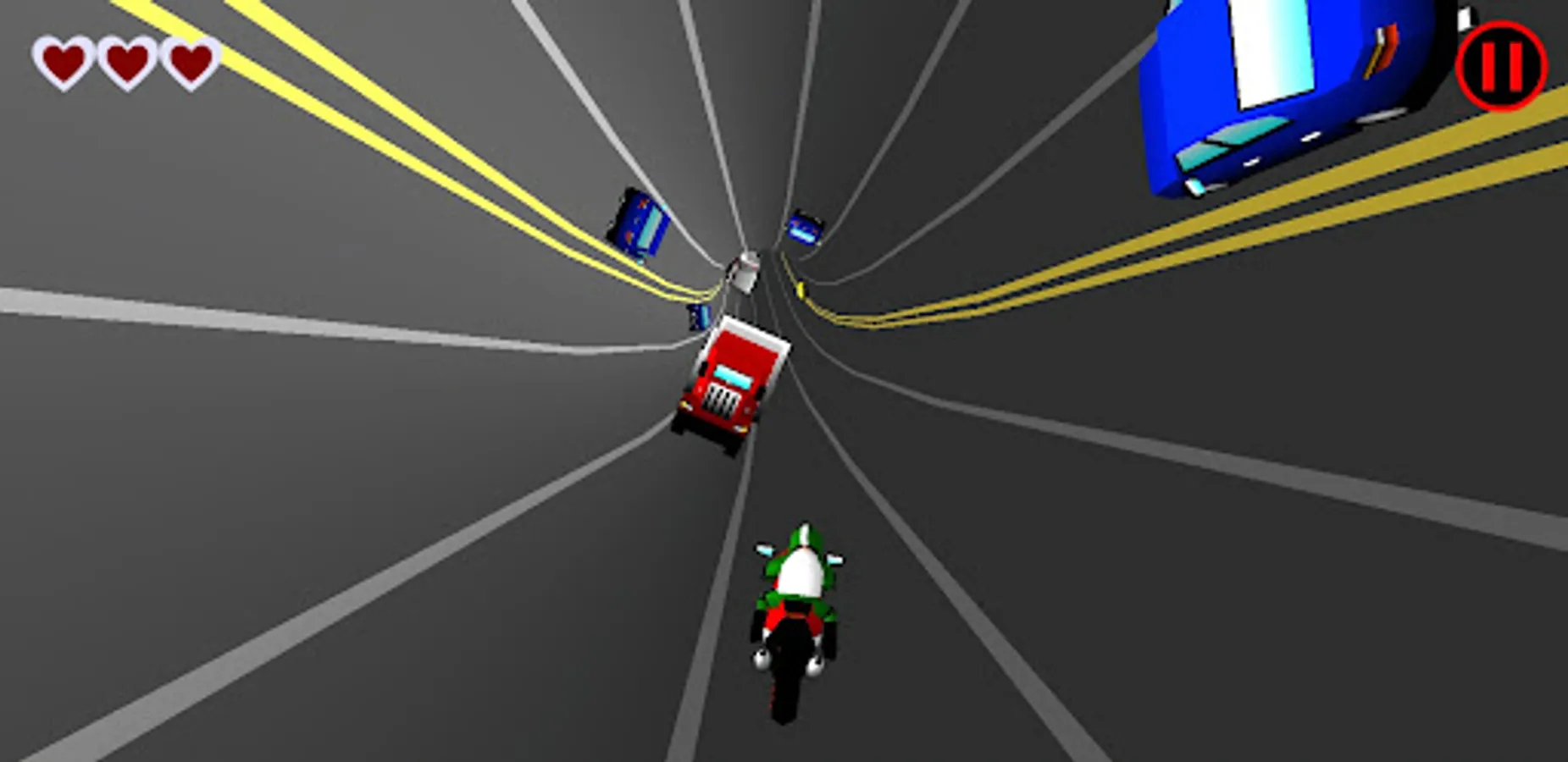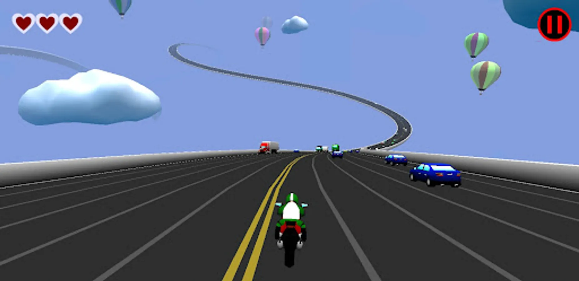 HIGH-way is a simple game about a sky biker. Avoid cars, trucks and other vehicles among the incoming traffic. The sky highway twists itself to form tunnels and tubes that change the game dynamic and makes difficult to dodge the traffic. Tilt your device towards a side to change the lane of your racing motorcycle. Do not crash your bike rider more than 2 times in this race against madness!