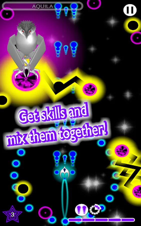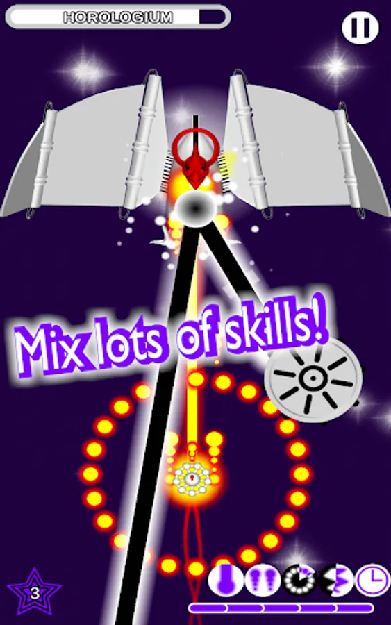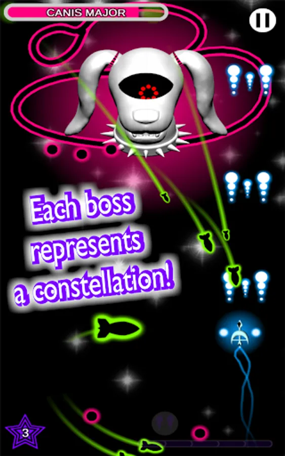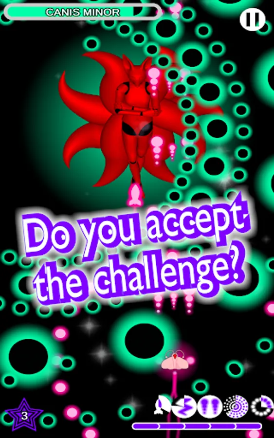 To provide a hard danmaku with a real challenge, these constellations have numerous phases of increasing difficulty; but don't worry: you can equip your spaceship with power-ups that allow you to have a double shot or even to stop time! After playing a while, you will unlock the ability to have multiple skills activated simultaneously.