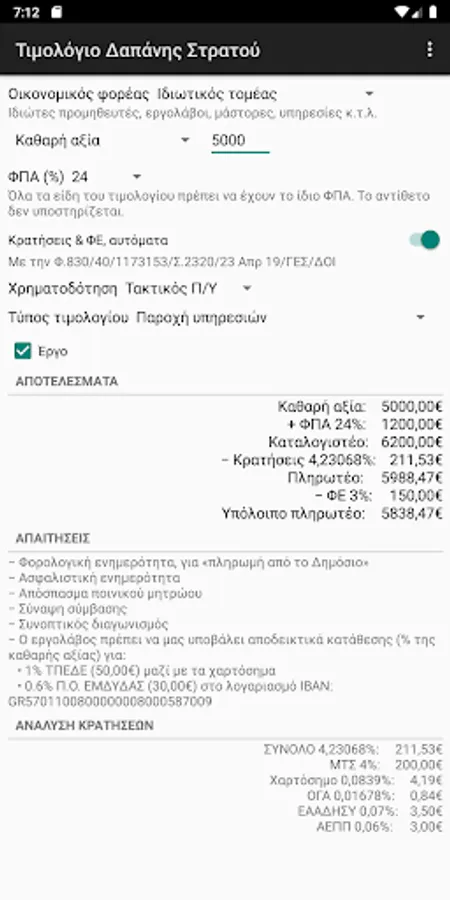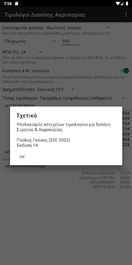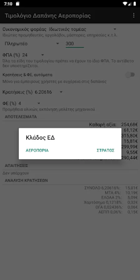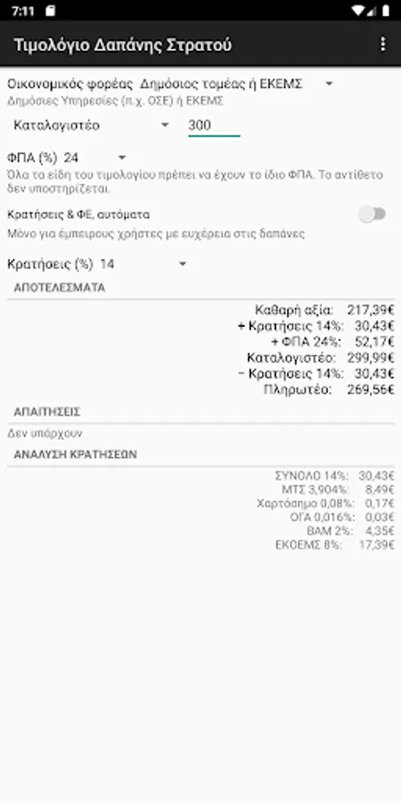 It calculates the elements of an expenditure invoice of the Hellenic Army or the Air Force and the Navy, based on the data that is the amount (net value, payable or imputable) as well as the VAT, VAT and withholding rates.