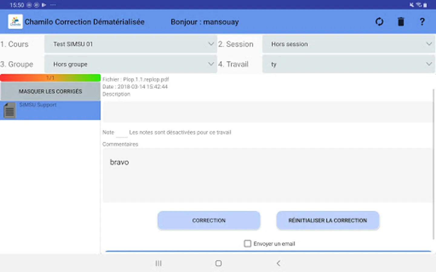 Via Chamilo's Works tool, the teacher has the possibility of uploading one or more work reports in pdf to the dematerialized correction tablet application.