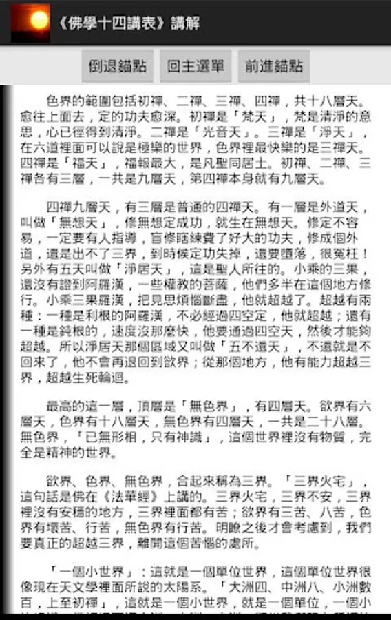 十四讲表共有十四个单元,具有完整的体系;前面七个单元是属于一般常识,后面七个单元是佛学领域,前后的顺序一脉相承,有层次,有条理。