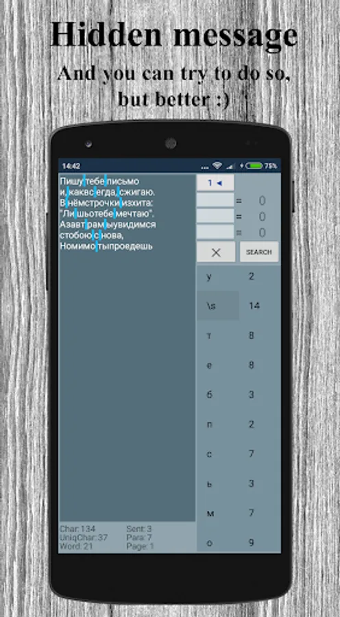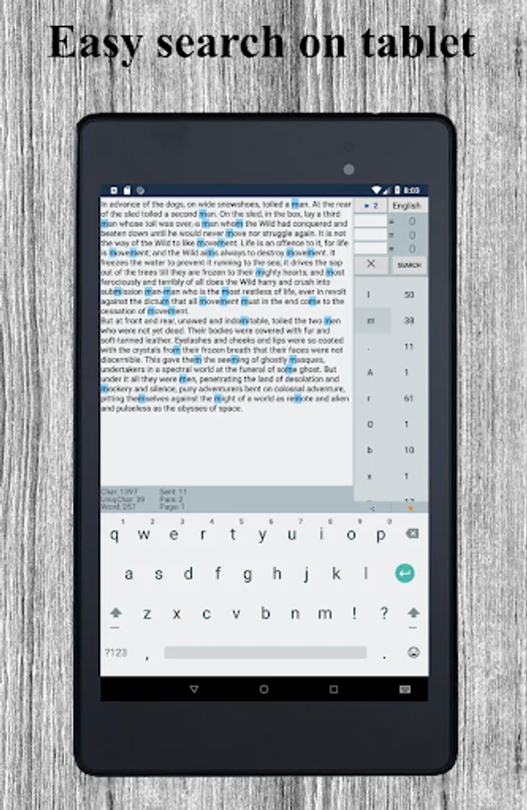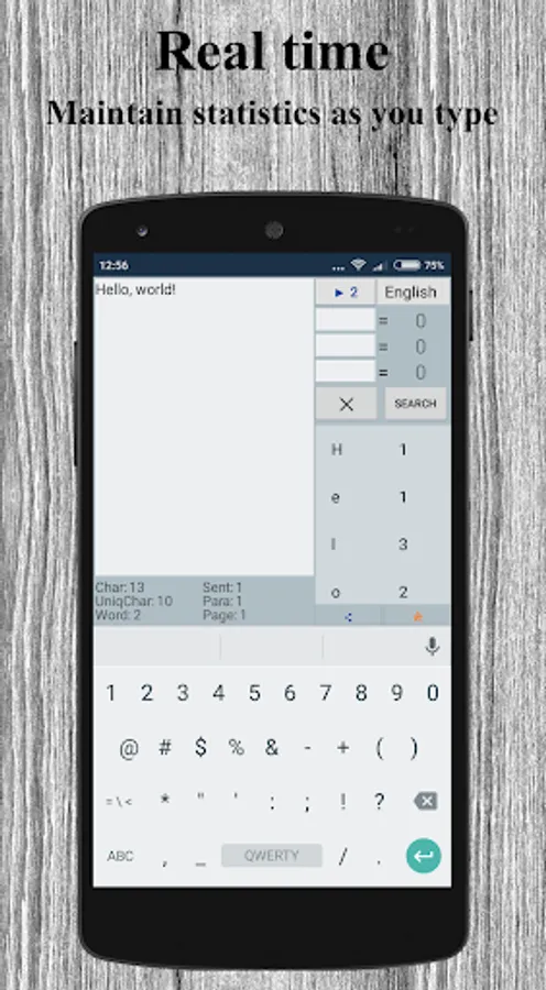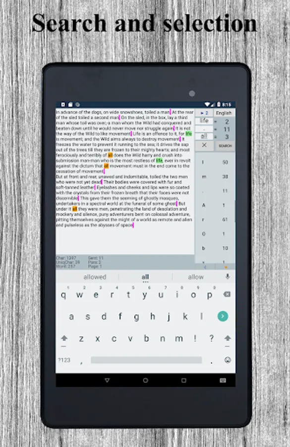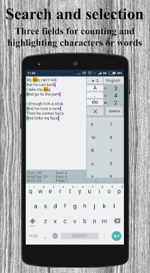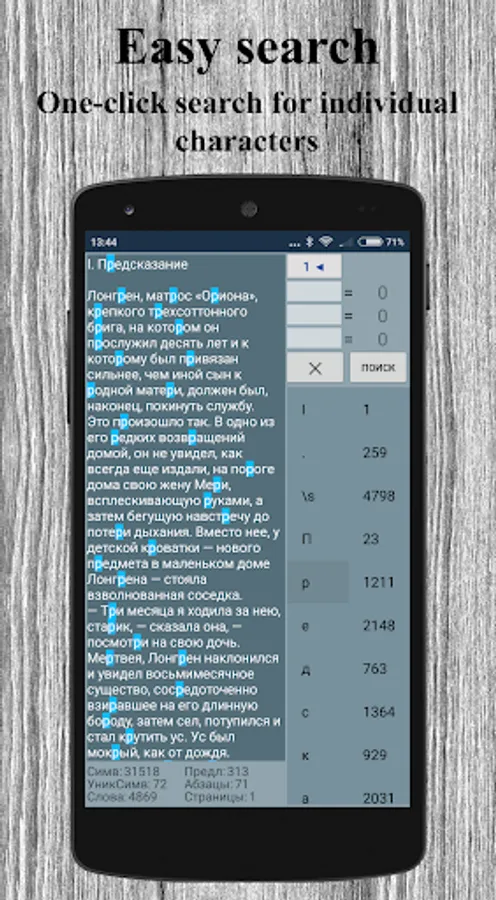 The application gathers text statistics: total number of characters, number of unique characters, number of words, sentences, paragraphs, pages, as well as the number of repetitions of each character.