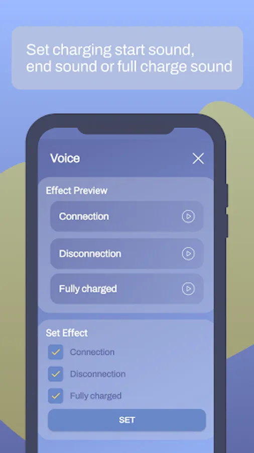 Personalize the charging connection sound, change the sound on disconnect, and set a unique sound for when your phone is fully charged. This app will play a sound whenever you connect or disconnect a power charger or when your phone is fully charged. Easily customize your battery charge sound with this Battery Charge sound - Custom battery charge sound alert app.