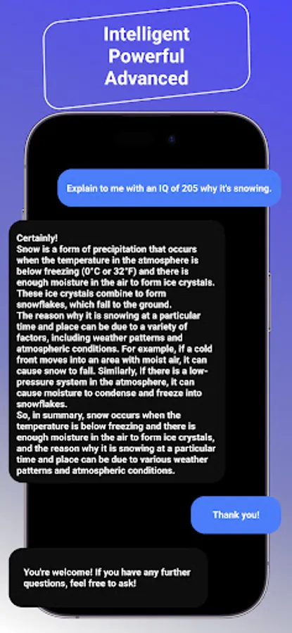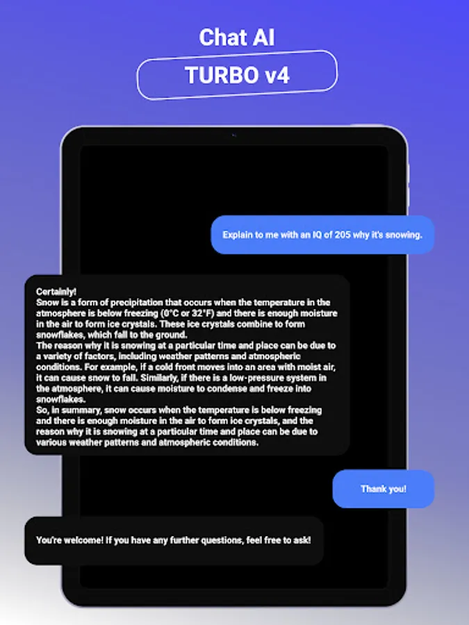 AI Chat 4 Pro communicates with you in natural language, making it easy and convenient to use. It can help you plan for the future or answer any questions you may have. Whether you need to learn about new technologies or get advice on business development - AI Chat 4 Pro has got you covered.