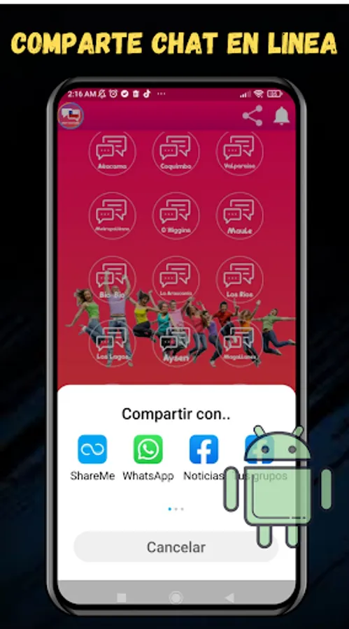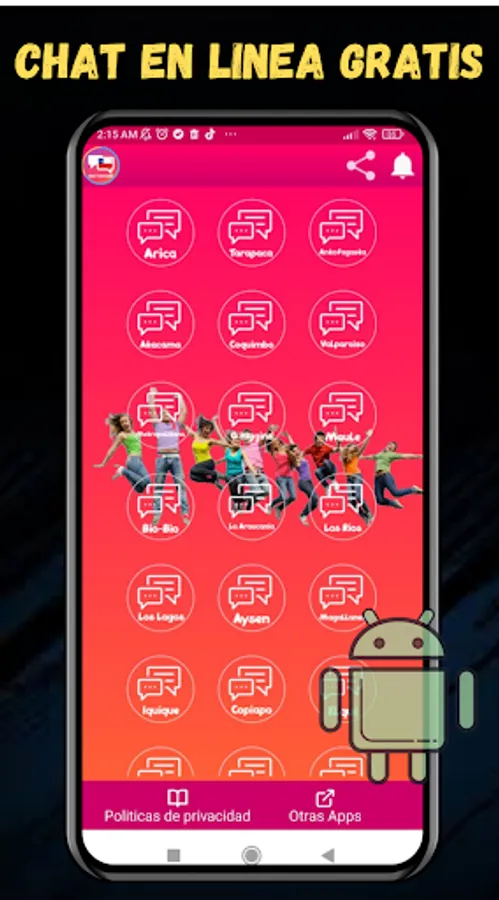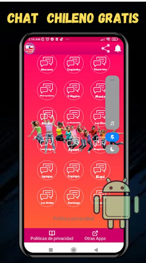 Esta App de Chat Cristiano cuenta con variedad de salas de distintos regiones del país de chile, tales como Chat Arica, chat Tarapacá, chat Antofagasta, chat atacama, chat Coquimbo, chat Valparaíso, chat metropolitana, chat O´Higgins, chat Maule, chat Bio-Bio, chat Araucanía, chat los ríos, chat los lagos, chat Aysén, chat Magallanes, chat Iquique, entre otros.
