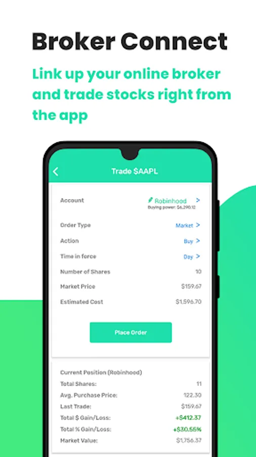 - Broker Connect: Link up your online broker and trade stocks right from the app; current integrations include ETrade, TDAmeritrade, Robinhood, and Webull