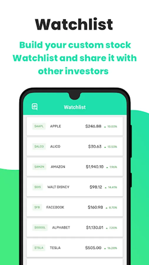 - Custom Watchlist: Build your custom stock Watchlist and share it with other investors