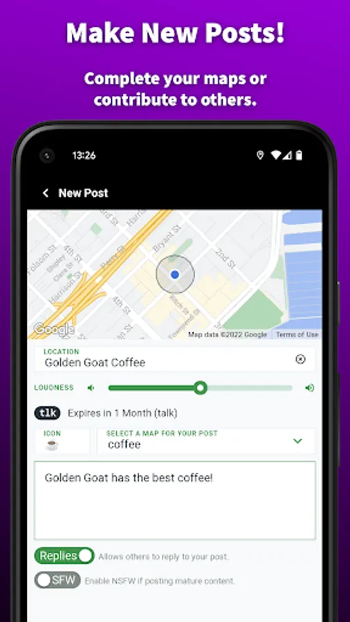 Use it to find food trucks, garage sales, good coffee, and more! Plan your next friendly scavenger hunt or leave surprise notes for your loved ones.
