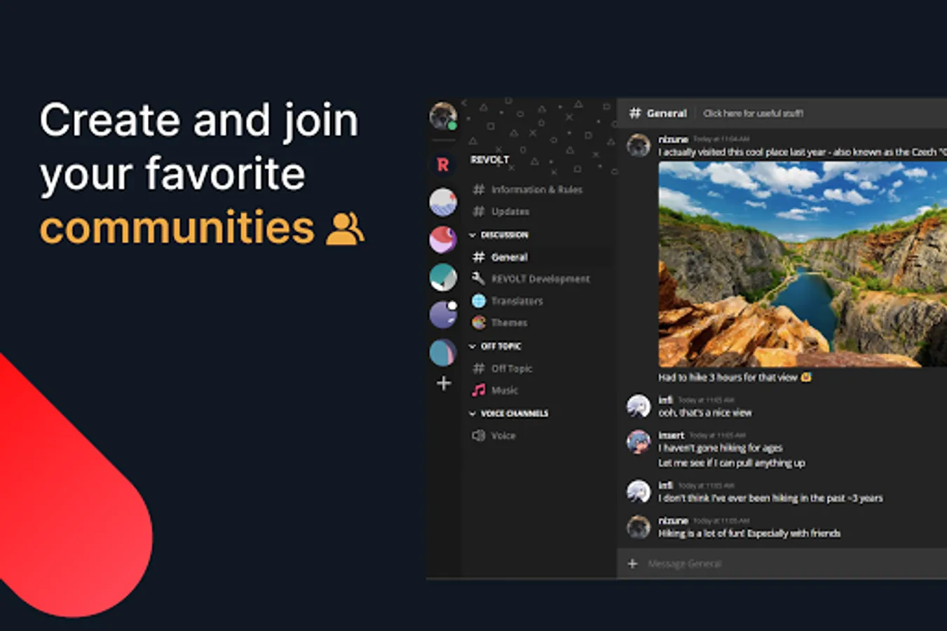 Revolt strives to create a free and open platform, allowing diversified communities of all kinds to thrive and to be fully transparent with our users. We believe everyone should have total freedom over how they talk with each other.