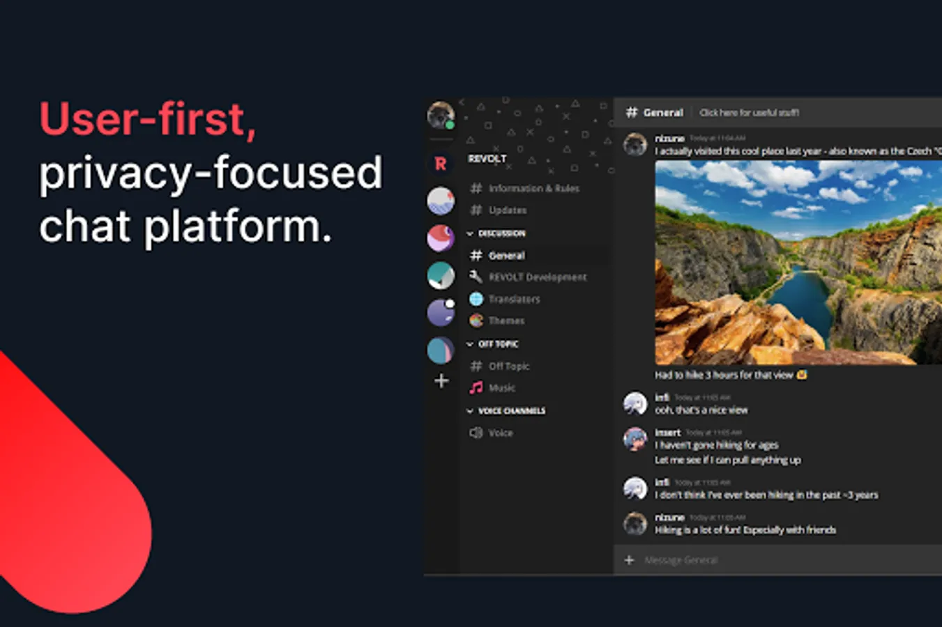Don't bother with other chat apps when communication is critical and privacy is essential. Revolt is a user-first, privacy focused chat platform. Best of all? It's both free and open-source.
