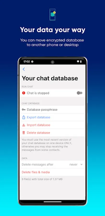 - encrypted portable chat database - you can transfer your chat contacts and history to another device.