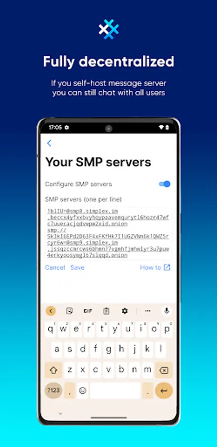 - decentralized proxied peer-to-peer network: you can use SimpleX Chat via your own relay servers and still communicate with people using pre-configured or any other SimpleX relay servers.