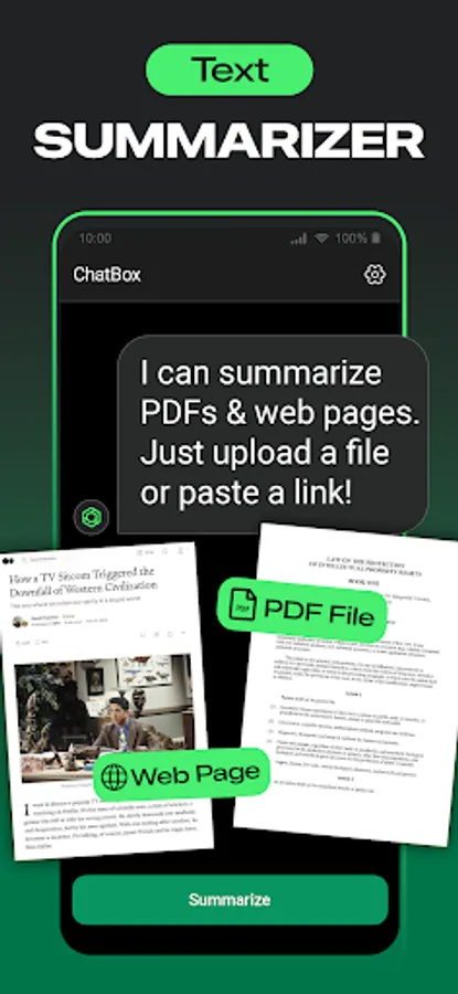 Being a ChatGPT API and GPT-4-powered AI chatbot, I can rapidly generate summaries for long texts, webpages, and PDFs.