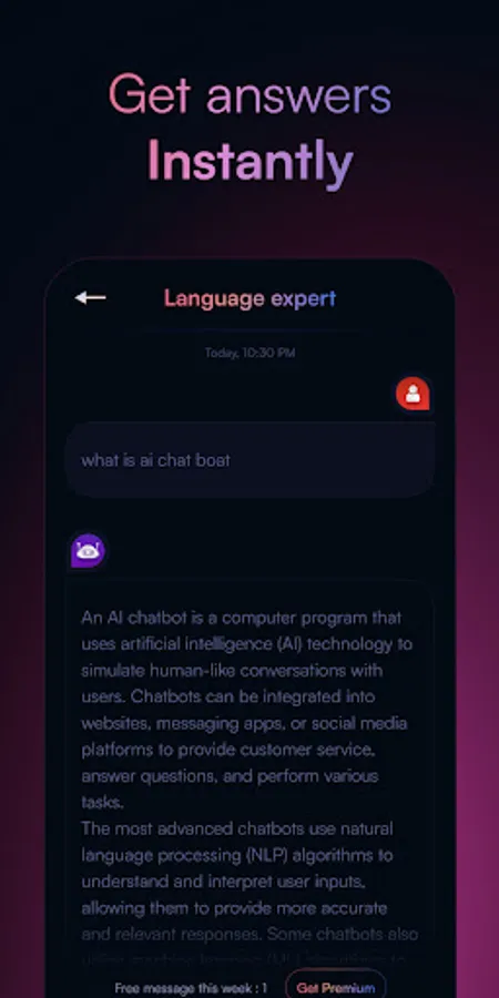 AI Chat : Smart Chatbot App is perfect for anyone looking to improve their writing skills, brainstorm new ideas, or have a friendly chat. With our intelligent and human-like chatbot, you get the assistance you need to accomplish your goals. So download AI Chatbot today and experience the power of the latest ChatGPT technology for yourself!