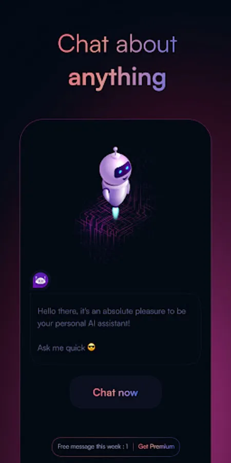 With AI Chat, you get a virtual assistant to help you 24/7. Our AI chatbot is always ready to assist you with anything you need, whether to get instant answers, write anything, get creatives, practice any language, chat about any topics, stay up-to-date with the latest news & trends, improve your skills, or make personalized recommendations, etc. Our chatbot is easy to use, and you'll be amazed at how quickly it can help you accomplish your goals.