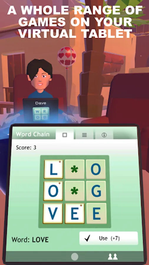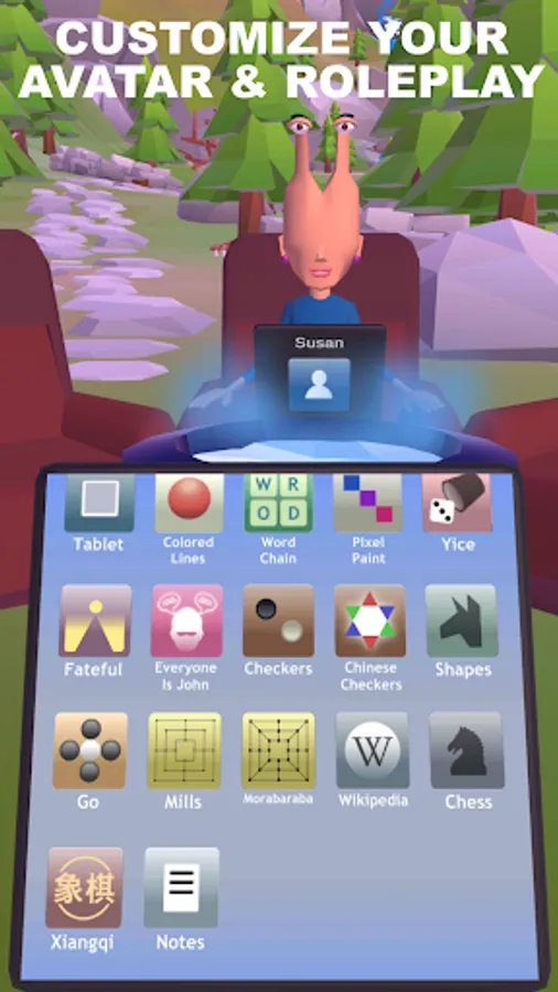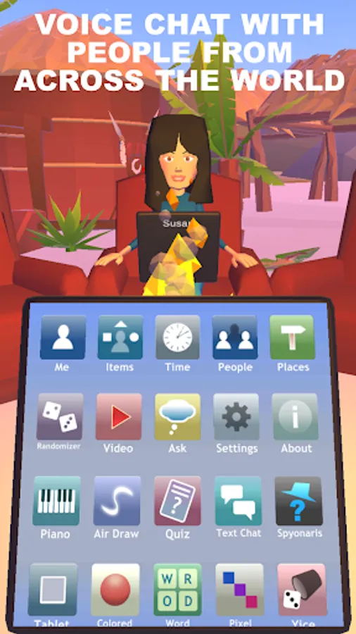 Sit together with up to 8 people in a circle in different 3d environments, and use your virtual tablet apps to have fun! Voice-chat while enjoying drawing tools, board games, video watching, trivia quizzes & much more. Customize your avatar to your liking, make new friends, relax and enjoy!