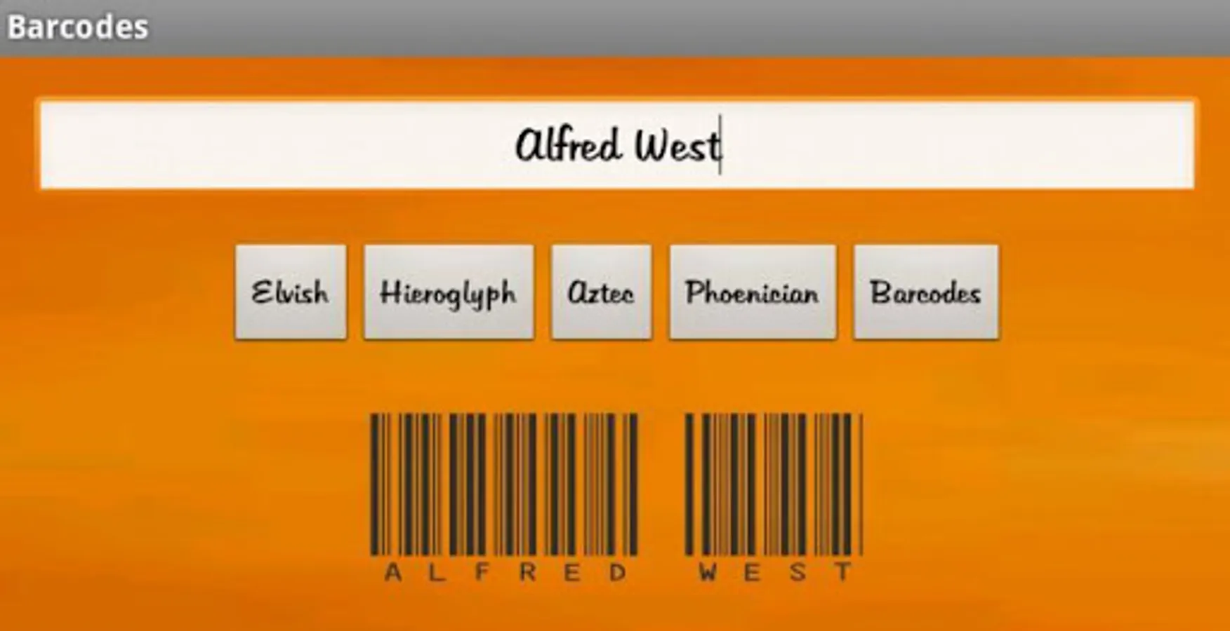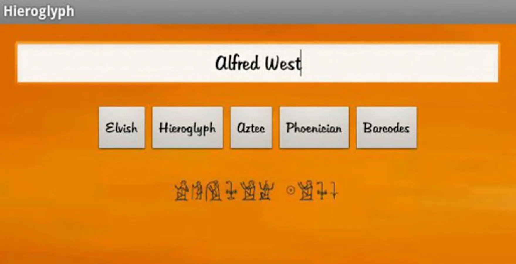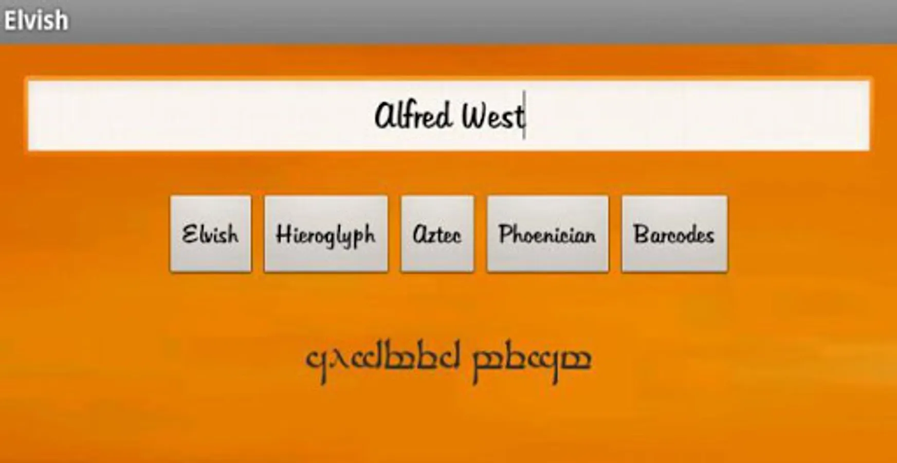 Enter your name: Elvish, Hieroglyphs, Azteca, Phoenician and Barcode