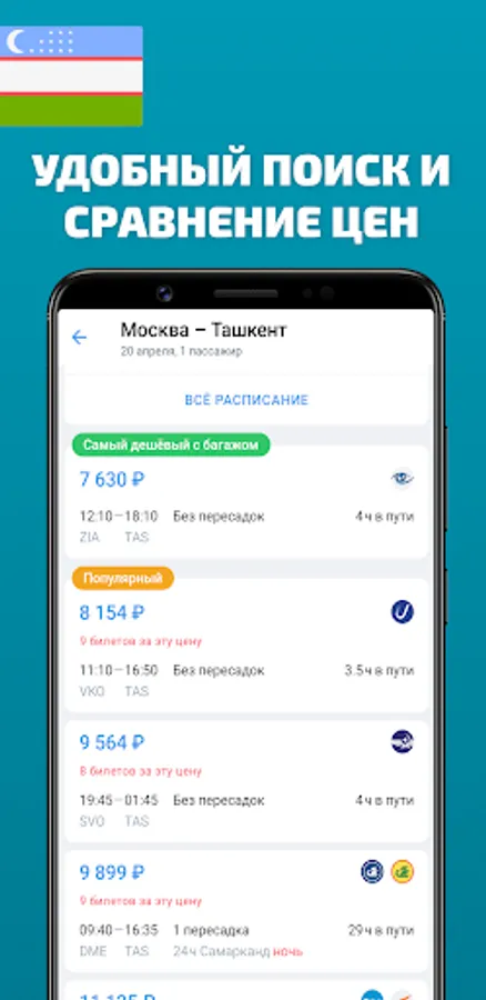 Our application sells direct and cheap tickets for flights through Uzbekistan Airways Airlines(havo yollari), Aeroflot, S7