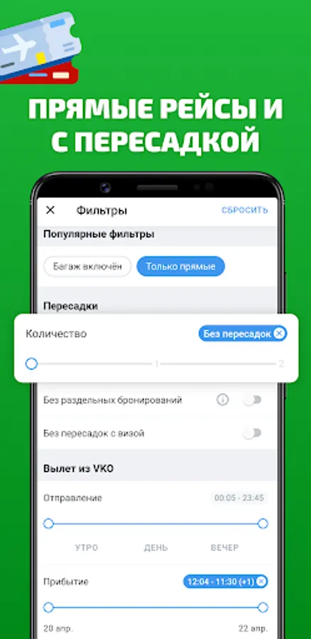A smart ticket search engine allows you to book round-trip tickets and find the most convenient and affordable options with and without transfers.