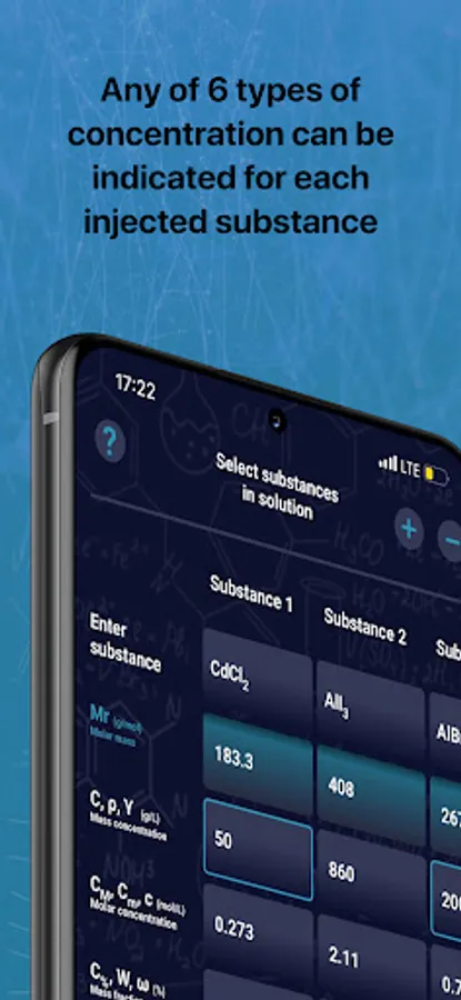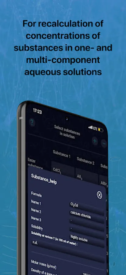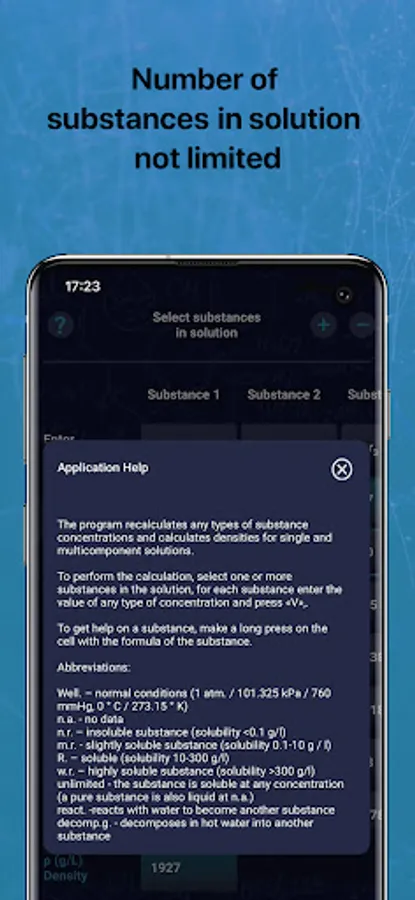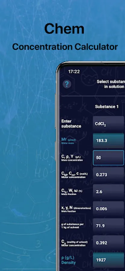The program is designed to recalculate the concentrations of substances in one- and multi- component aqueous solutions. The program also calculates the concentration of water and the solution density. For each chosen substance any of 6 concentration types can be entered: mass (g/l), molar (mol/l), mass fraction (%), mole fraction (dimensionless, from 0 to 1), g/kg of solvent, molal (mol/kg solvent). The number of substances in the solution is not limited. For chosen substancesn an info with brief description and maximum solubility can be displayed. For calculating of the density temperature is taken into account (entered in degrees Celsius or Kelvin). Density is calculated through the molar volumes of substances.