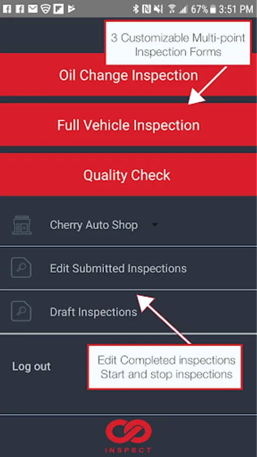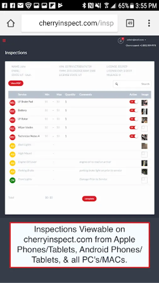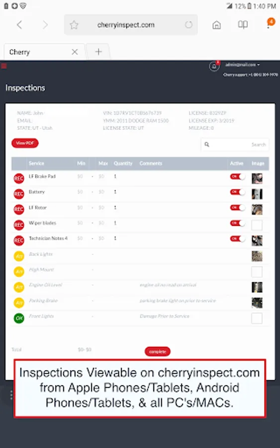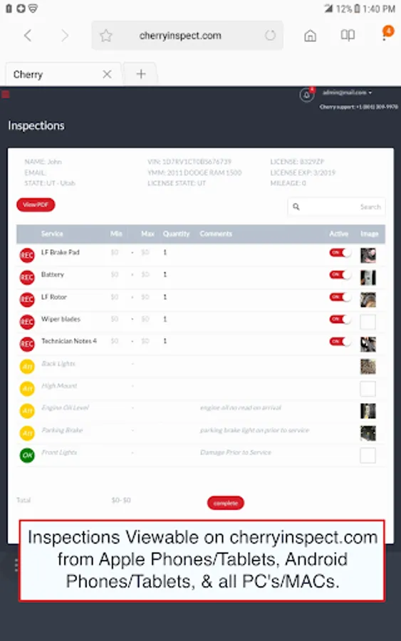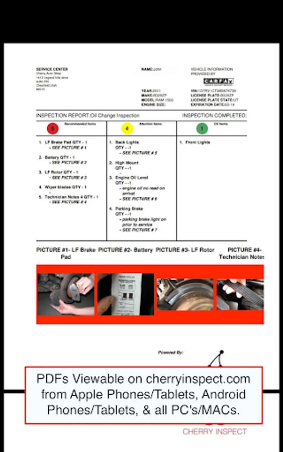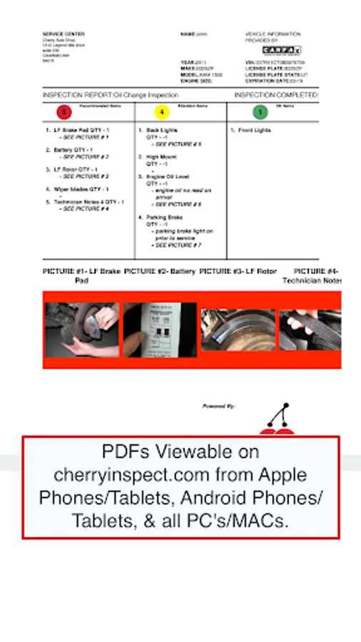 This app is specifically for the use by Mechanics and Technicians at any Automotive Service Center to save time and effort on recording the service inspection results. When it is time to do a thorough inspection, the technician can open the Cherry Inspect App and select 1 of 3 customizable inspections. Having the ability to add comments, pictures and decipher between Okay items and Recommended items clearly. Adding a vehicle to the inspection is done with our CarFax integration. It allows for easy and quick vehicle search by License Plate or Vin Scan. After submitting the selected inspection, the results can be viewed from any Phone, Tablet or Computer via our website www.cherryinspect.com