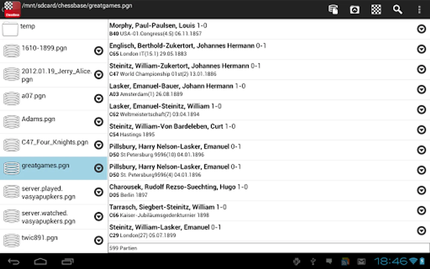 - Delete the file „greatgames.pgn“ from the folder „ChessBase“ on your smart card. The ChessBase App will automatically create the file at program start again.