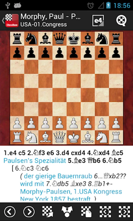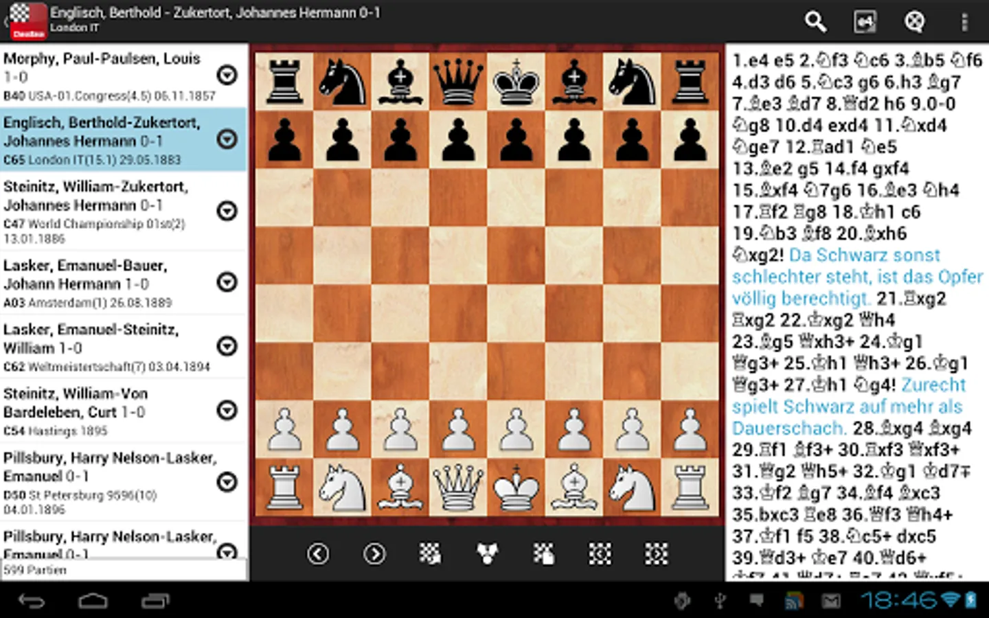 * Enjoy chess history by replaying 600 annotated master games from 1857 to 2011. The display includes international annotation symbols, coloured squares and arrows.