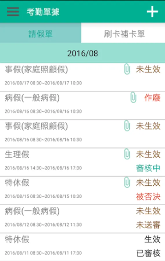CHIAPP線上請假整合正航T8/T9/NBS ERP系統上的考勤資料,讓你隨時都能查詢個人考勤及出勤狀況,並能在上面新增請假單及刷卡補卡單。