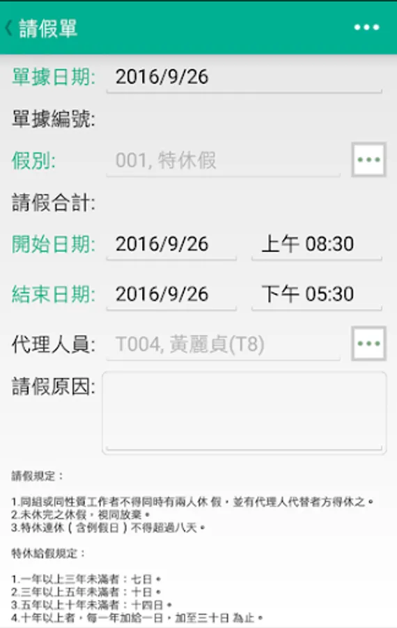 考勤單據:查詢及新增請假單及刷卡補卡單。