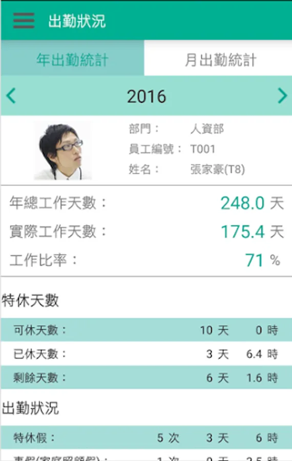 出勤狀況:查詢個人年度及各月出勤統計。