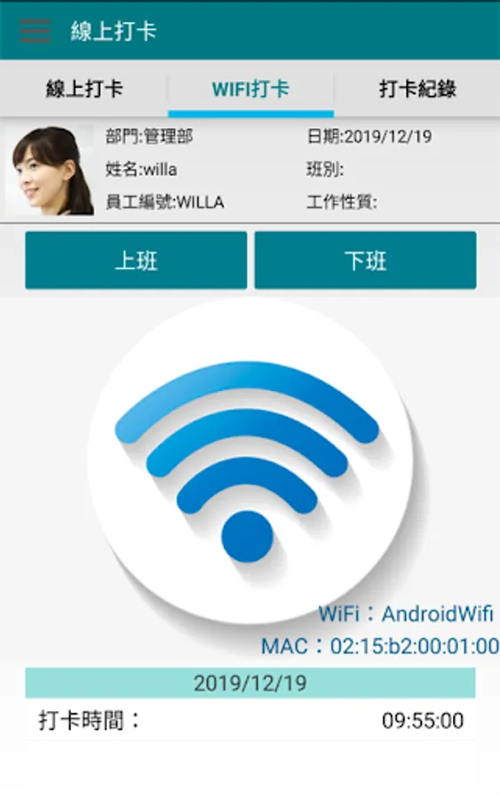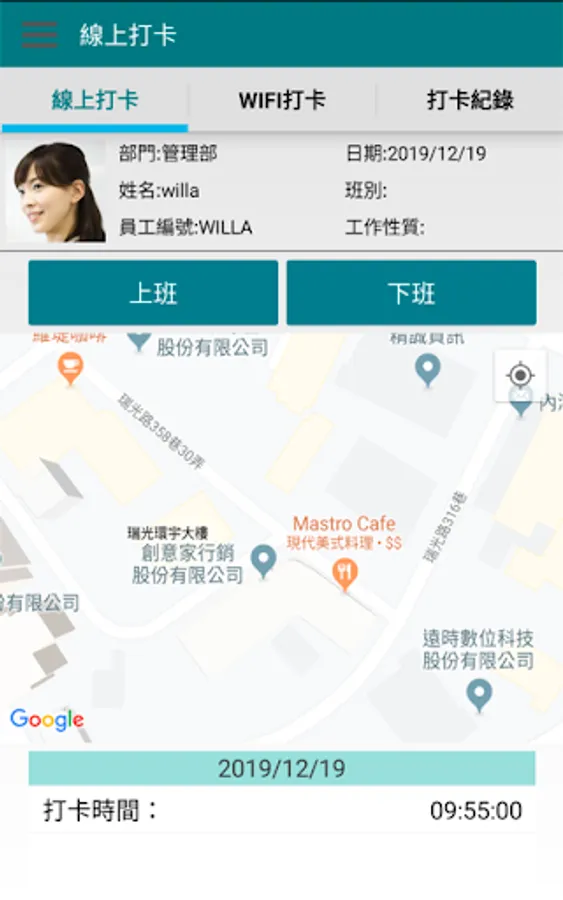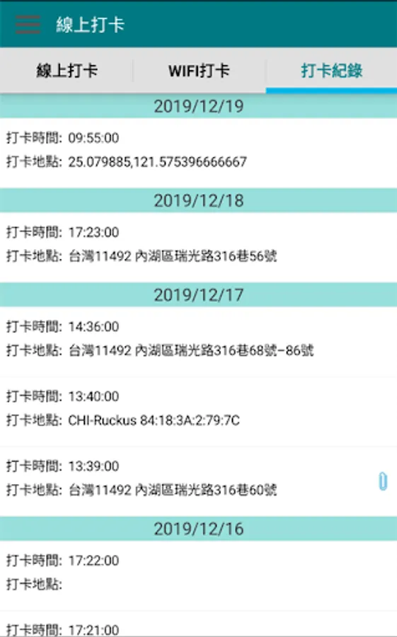 打卡紀錄:查詢個人每天打卡時間及地點紀錄。