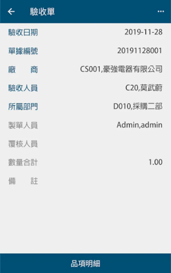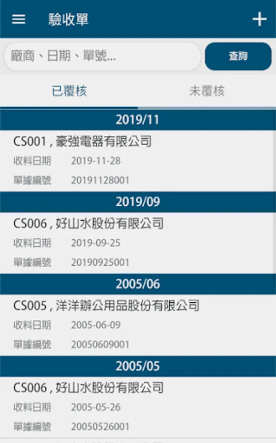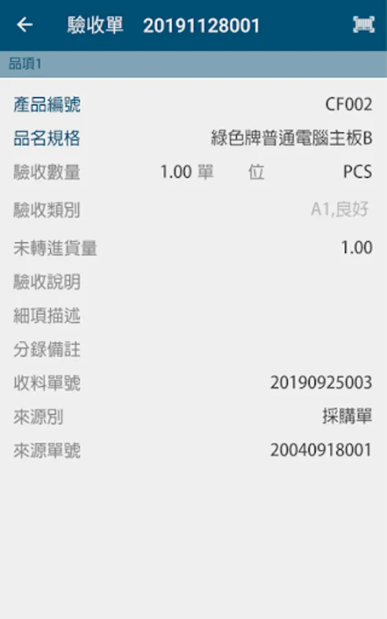 正航APP線上驗收整合正航系列ERP系統上的驗收/收料憑單資料,讓你可以在線上進行驗收/收料憑單的查詢與新增作業。