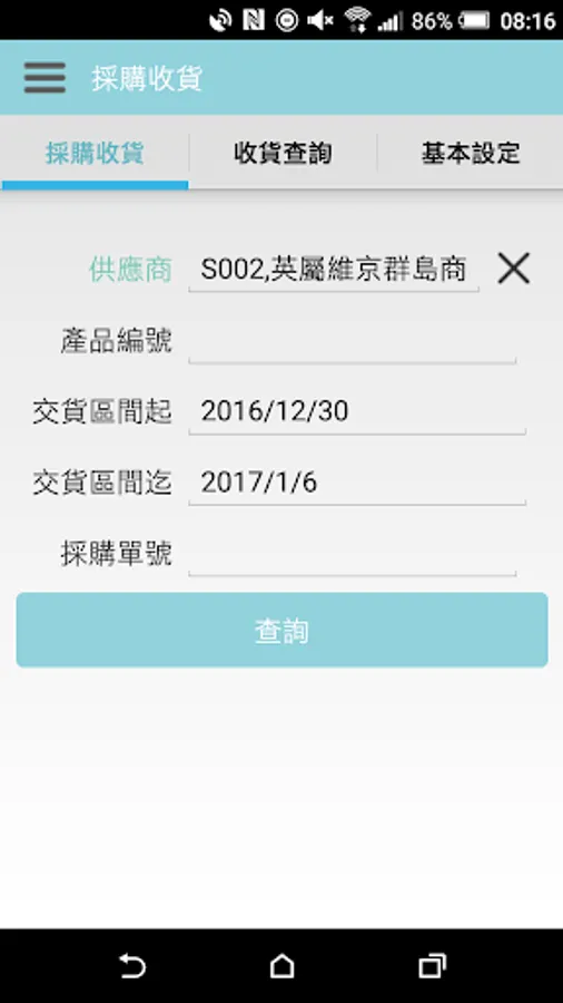 採購收貨:依據條件對已登打的採購單產品進行收貨確認。